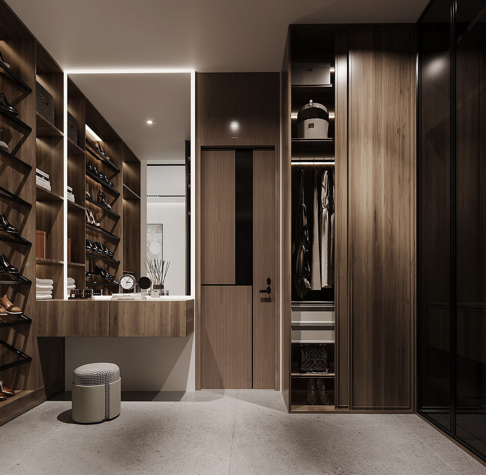 The "Timeless Elegance" dressing table offers a blend of classic design and modern functionality. Featuring rich wood tones and a spacious layout, this piece provides ample storage with open shelving and concealed drawers. The large mirror, framed with subtle lighting, adds a touch of glamour while ensuring practical use. This dressing table is perfect for creating a serene and organized space, seamlessly fitting into various interior styles.